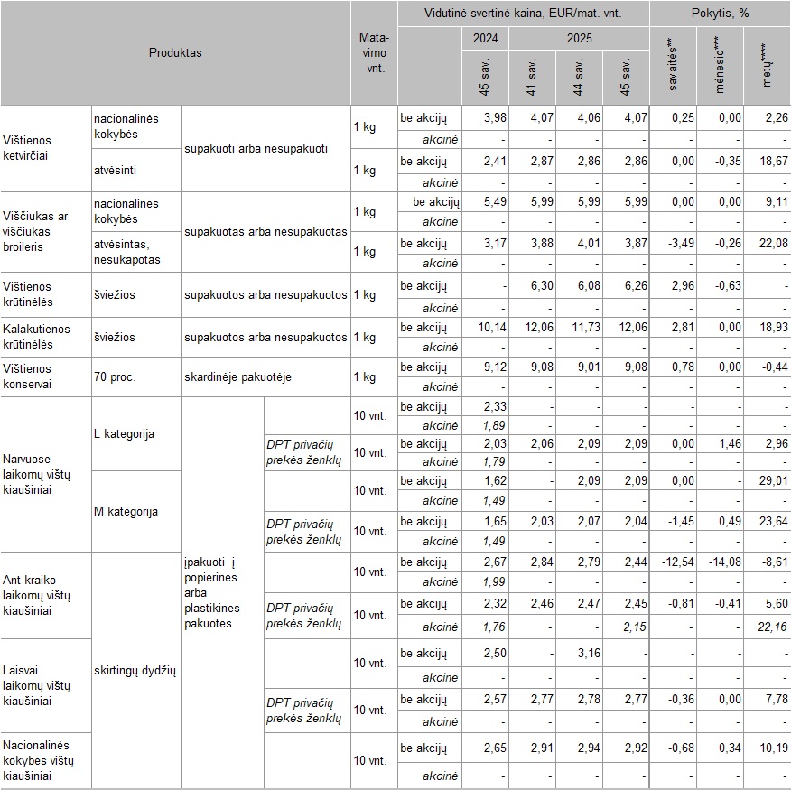 Paukštienos produktų ir kiaušinių vidutinės mažmeninės kainos Lietuvos didžiųjų prekybos tinklų (DPT) parduotuvėse* 2024–2025 m. 45 sav.