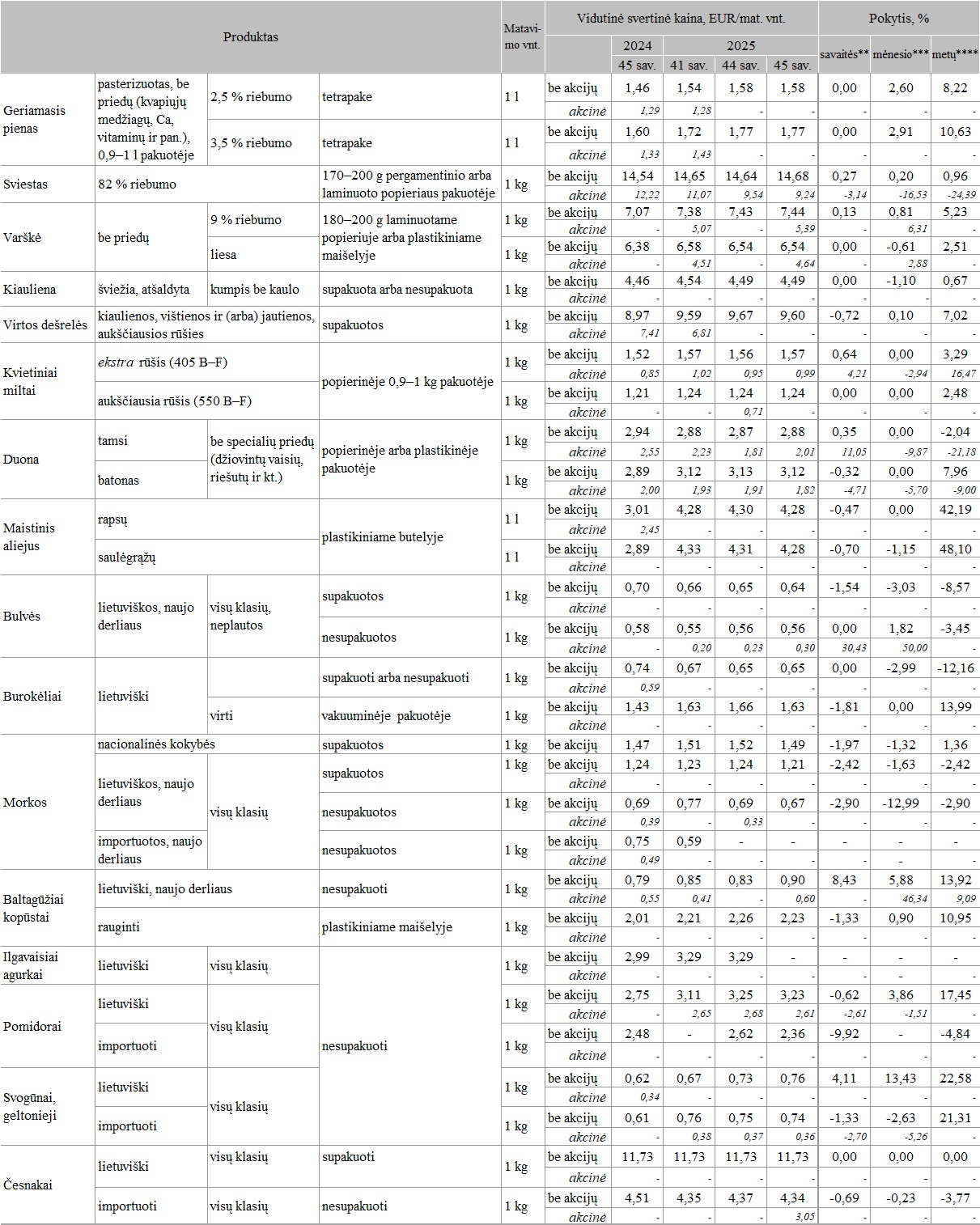 * kainos registruojamos Vilniaus, Kauno, Šiaulių, Panevėžio ir Alytaus miestų UAB „Lidl Lietuva“, UAB „Maxima LT“, UAB „Norfos mažmena“, UAB „IKI Lietuva“ ir UAB „Rimi Lietuva“ prekybos tinklų parduotuvėse. Apskaičiuojant vidutines mažmenines produktų kainas, neįtraukiamos prekybos tinklų privačių prekių ženklų produktų kainos.