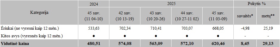 Avių kainos Lietuvos įmonėse 2025 m. 42-45 sav., EUR/100 kg skerdenų (be PVM)