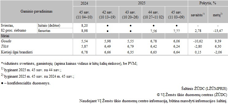 Kai kurių Lietuvos pieno perdirbimo įmonėse pagamintų pieno gaminių pardavimo kainos* 2025 m. 42–45 sav., EUR/kg
