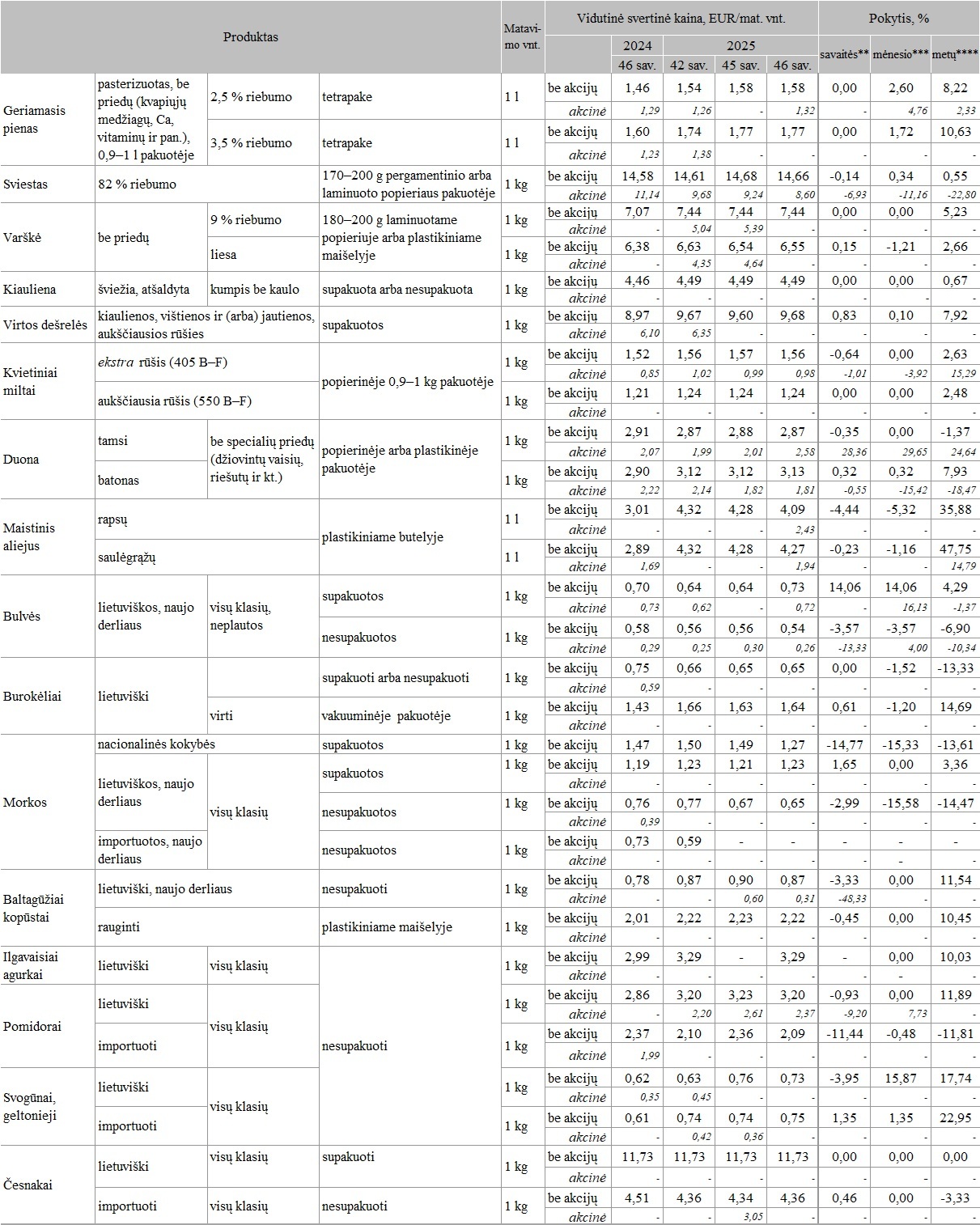 * kainos registruojamos Vilniaus, Kauno, Klaipėdos, Panevėžio ir Marijampolės miestų UAB „Lidl Lietuva“, UAB „Maxima LT“, UAB „Norfos mažmena“, UAB „IKI Lietuva“ ir UAB „Rimi Lietuva“ prekybos tinklų parduotuvėse. Apskaičiuojant vidutines mažmenines produktų kainas, neįtraukiamos prekybos tinklų privačių prekių ženklų produktų kainos.