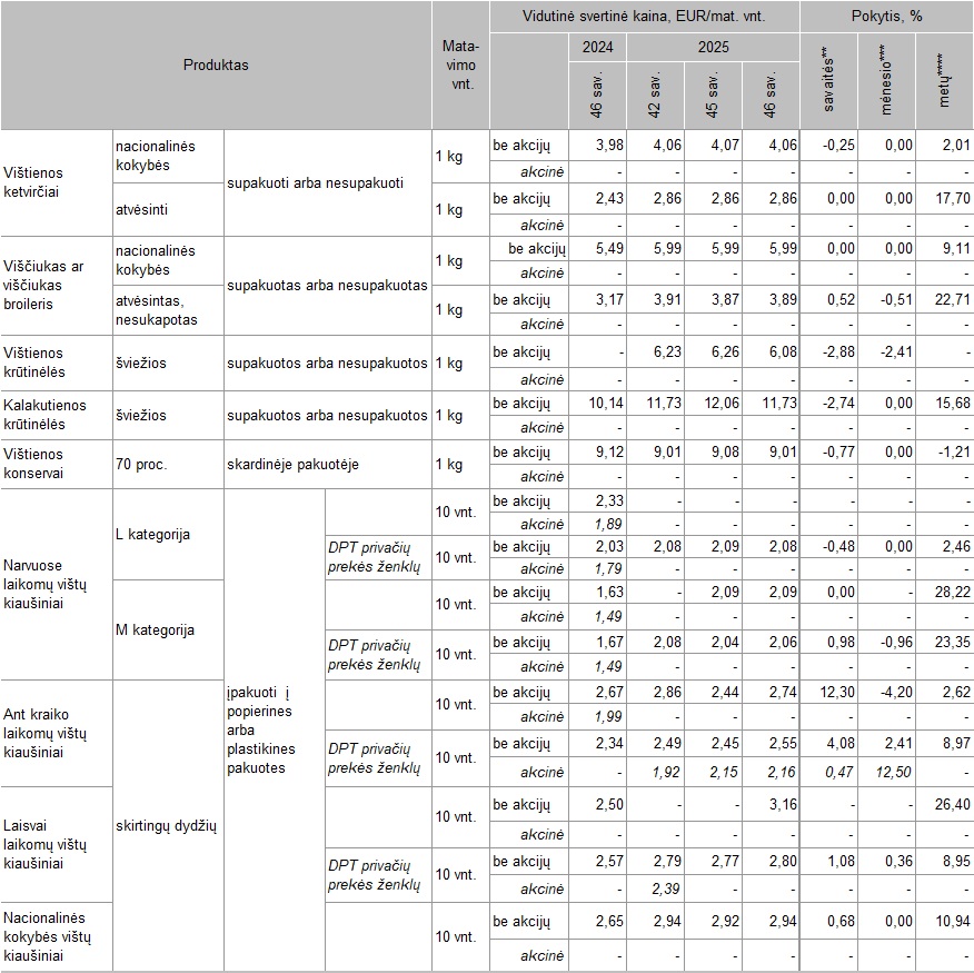 Paukštienos produktų ir kiaušinių vidutinės mažmeninės kainos Lietuvos didžiųjų prekybos tinklų (DPT) parduotuvėse* 2024–2025 m. 46 sav.