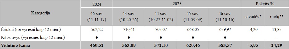 Avių kainos Lietuvos įmonėse 2025 m. 43-46 sav., EUR/100 kg skerdenų (be PVM)