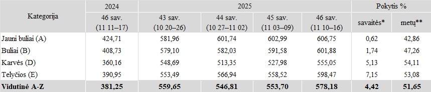 Galvijų supirkimo kainos Lietuvos įmonėse 2025 m. 43–46 sav., EUR/100 kg skerdenų (be PVM)