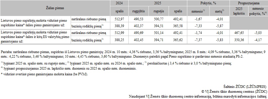 Žalio pieno, supirkto Lietuvoje iš pieno gamintojų, supirkimo kainos 2025 m. rugpjūčio–spalio mėn., EUR/t