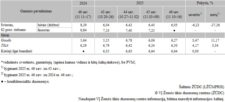 Kai kurių Lietuvos pieno perdirbimo įmonėse pagamintų pieno gaminių pardavimo kainos* 2025 m. 43–46 sav., EUR/kg