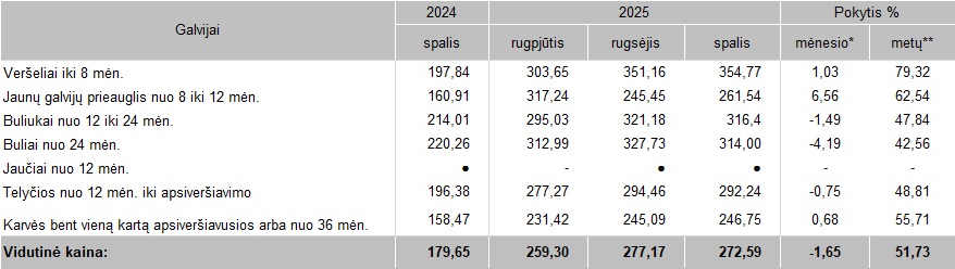 Galvijų supirkimo kainos Lietuvos įmonėse 2025 m. rugpjūčio–spalio mėn., EUR/100 kg gyvojo svorio (be PVM)