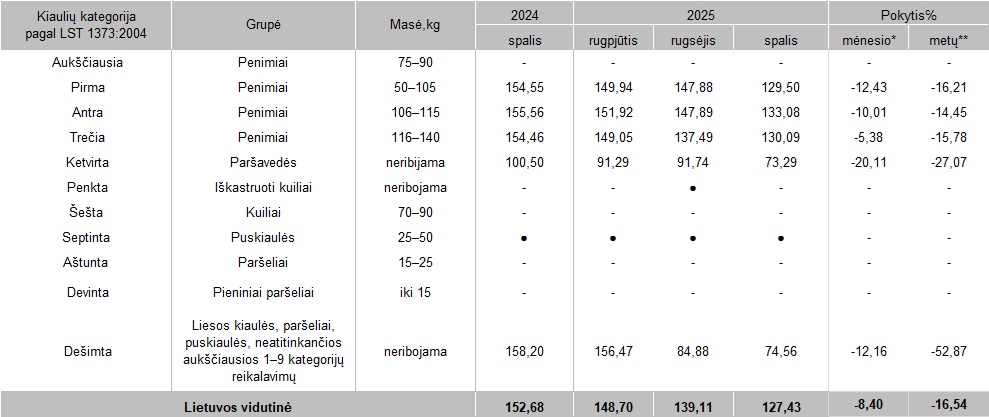 Kiaulių supirkimo kainos pagal gyvojo svorio kategorijas Lietuvos įmonėse 2025 m. rugpjūčio–spalio mėn., EUR/100 kg gyvojo svorio (be PVM)