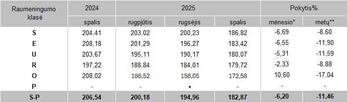 Kiaulių supirkimo kainos Lietuvos įmonėse 2025 m. rugpjūčio–spalio mėn., EUR/100 kg skerdenų (be PVM)