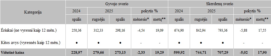 Avių supirkimo kainos Lietuvos įmonėse 2025 m. rugsėjo–spalio mėn., EUR/100kg (be PVM)