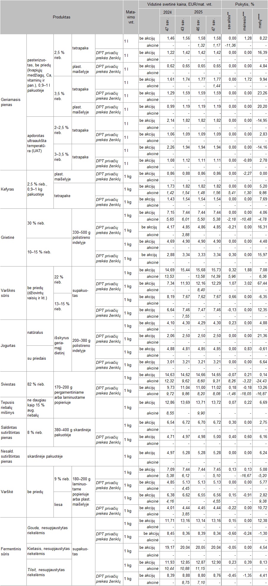 * kainos registruojamos Vilniaus, Kauno, Šiaulių, Panevėžio ir Alytaus miestų UAB „Lidl Lietuva“, UAB „Maxima LT“, UAB „Norfos mažmena“, UAB „IKI Lietuva“ ir UAB „Rimi Lietuva“ prekybos tinklų parduotuvėse