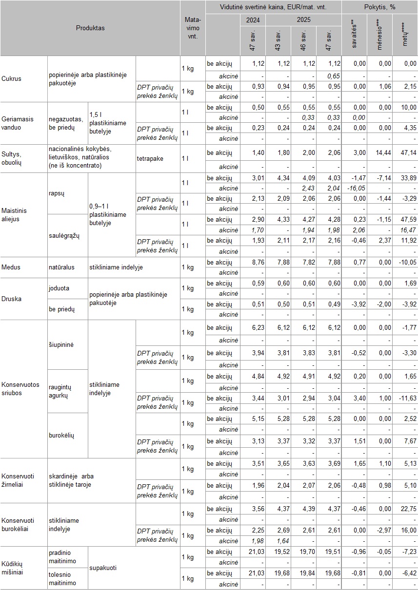 * kainos registruojamos Vilniaus, Kauno, Šiaulių, Panevėžio ir Alytaus miestų UAB „Lidl Lietuva“, UAB „Maxima LT“, UAB „Norfos mažmena“, UAB „IKI Lietuva“ ir UAB „Rimi Lietuva“ prekybos tinklų parduotuvėse