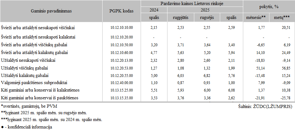 Kai kurių Lietuvos įmonėse pagamintų paukštienos gaminių vidutinės pardavimo kainos 2025 m. rugsėjo–spalio mėn. EUR/kg