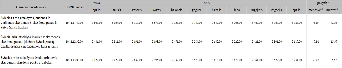Kai kurių Lietuvos įmonėse pagamintų mėsos gaminių vidutinės pardavimo kainos* Lietuvos rinkoje 2025 m. sausio-spalio mėn. ir 2024 m. spalio mėn., EUR/t