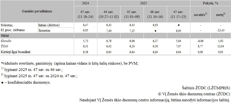 Kai kurių Lietuvos pieno perdirbimo įmonėse pagamintų pieno gaminių pardavimo kainos* 2025 m. 44–47 sav., EUR/kg