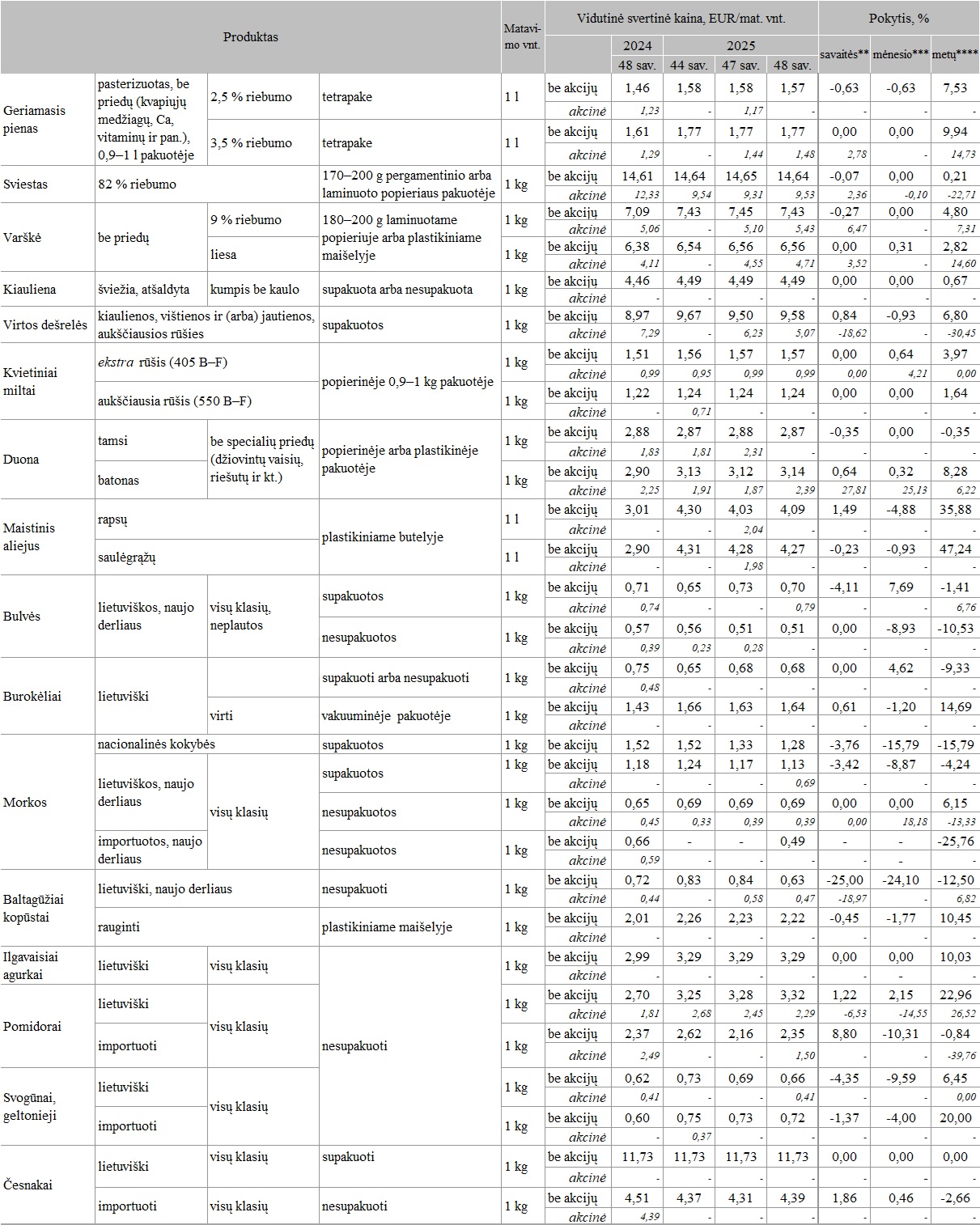 * kainos registruojamos Vilniaus, Kauno, Klaipėdos, Panevėžio ir Marijampolės miestų UAB „Lidl Lietuva“, UAB „Maxima LT“, UAB „Norfos mažmena“, UAB „IKI Lietuva“ ir UAB „Rimi Lietuva“ prekybos tinklų parduotuvėse. Apskaičiuojant vidutines mažmenines produktų kainas, neįtraukiamos prekybos tinklų privačių prekių ženklų produktų kainos.