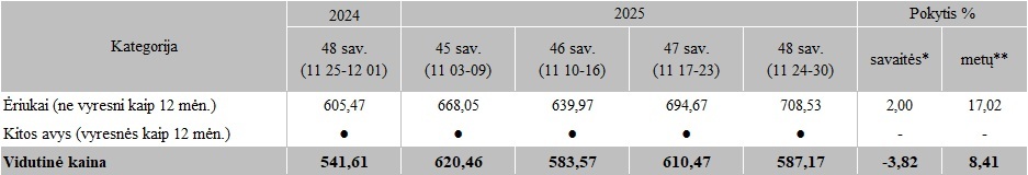Avių kainos Lietuvos įmonėse 2025 m. 45-48 sav., EUR/100 kg skerdenų (be PVM)