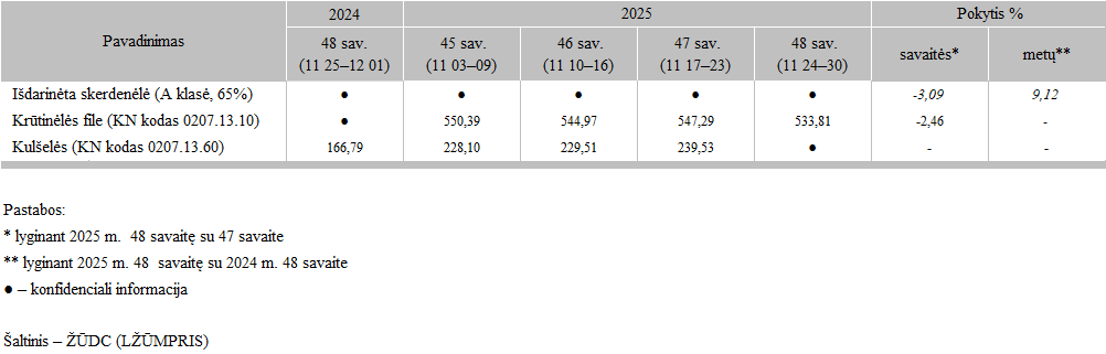 Viščiukų broilerių skerdenų ir gabalų pardavimo vidutinės didmeninės kainos Lietuvos įmonėse 2025 m. 45–48 sav. EUR/100 kg (be PVM)