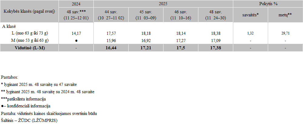 Ant kraiko laikomų vištų kiaušinių pardavimo vidutinės didmeninės kainos Lietuvos įmonėse 2025 m. 45–48 sav. EUR/100 vnt. (be PVM)