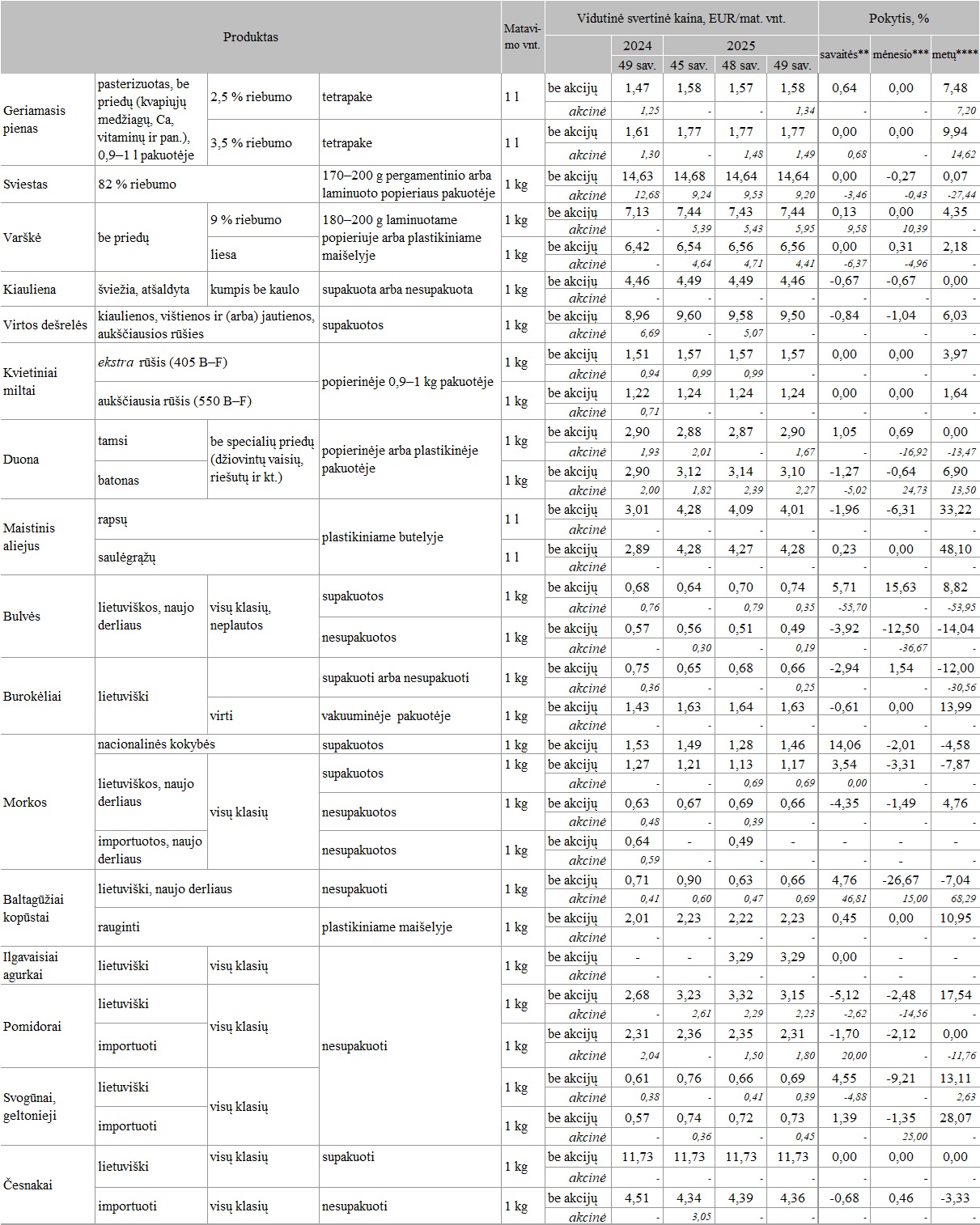 * kainos registruojamos Vilniaus, Kauno, Šiaulių, Panevėžio ir Alytaus miestų UAB „Lidl Lietuva“, UAB „Maxima LT“, UAB „Norfos mažmena“, UAB „IKI Lietuva“ ir UAB „Rimi Lietuva“ prekybos tinklų parduotuvėse. Apskaičiuojant vidutines mažmenines produktų kainas, neįtraukiamos prekybos tinklų privačių prekių ženklų produktų kainos.