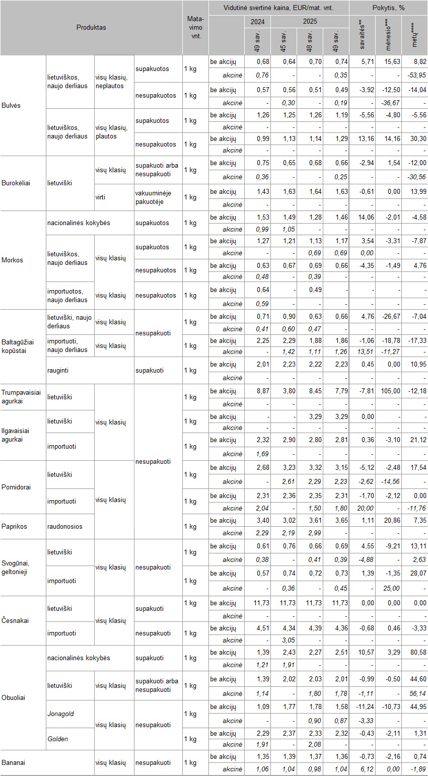 Bulvių, daržovių ir vaisių vidutinės mažmeninės kainos Lietuvos didžiųjų prekybos tinklų parduotuvėse* 2024–2025 m. 49 sav.