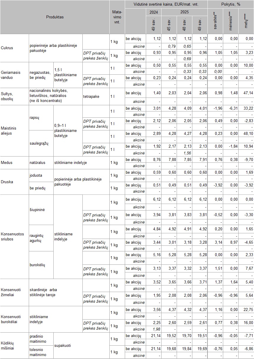 * kainos registruojamos Vilniaus, Kauno, Šiaulių, Panevėžio ir Alytaus miestų UAB „Lidl Lietuva“, UAB „Maxima LT“, UAB „Norfos mažmena“, UAB „IKI Lietuva“ ir UAB „Rimi Lietuva“ prekybos tinklų parduotuvėse