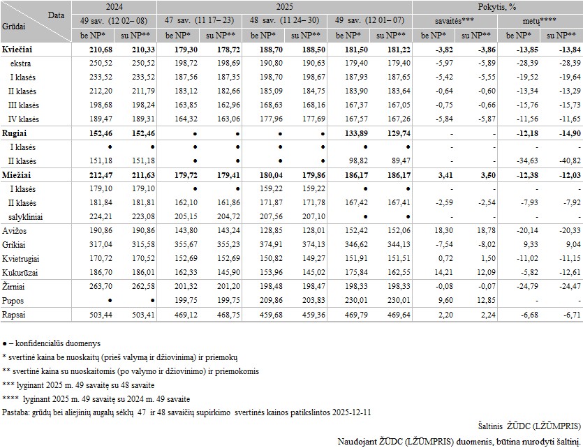 Grūdų supirkimo kainos (iš augintojų ir kitų vidaus rinkos ūkio subjektų) Lietuvoje 2025 m. 47–49 sav., EUR/t (be PVM)