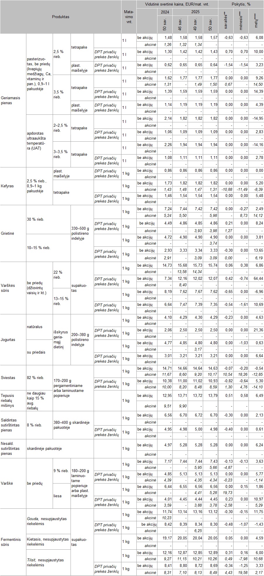 * kainos registruojamos Vilniaus, Kauno, Klaipėdos, Panevėžio ir Marijampolės miestų UAB „Lidl Lietuva“, UAB „Maxima LT“, UAB „Norfos mažmena“, UAB „IKI Lietuva“ ir UAB „Rimi Lietuva“ prekybos tinklų parduotuvėse