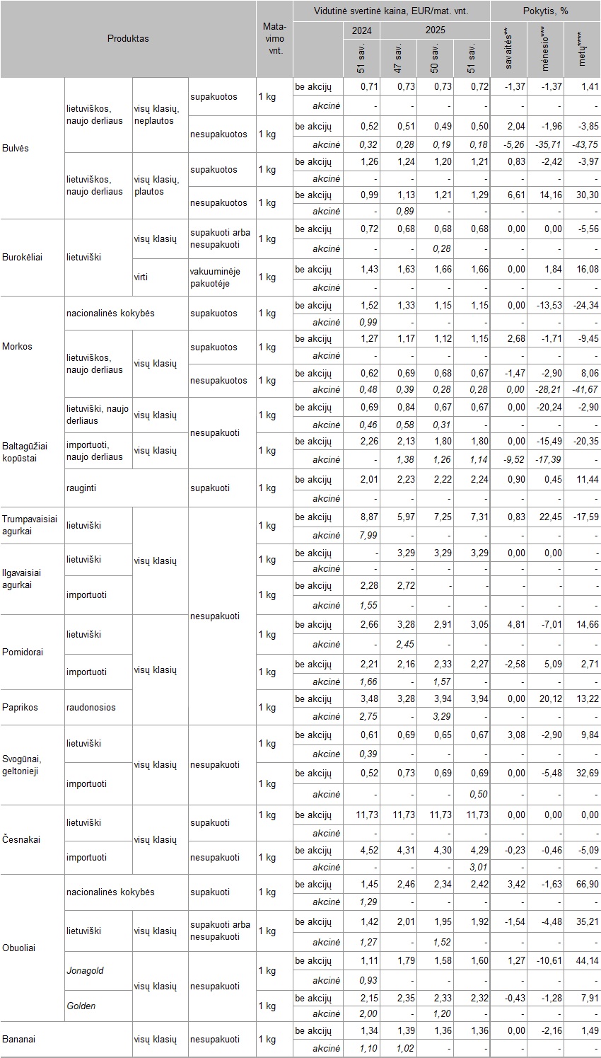 Bulvių, daržovių ir vaisių vidutinės mažmeninės kainos Lietuvos didžiųjų prekybos tinklų parduotuvėse* 2024–2025 m. 51 sav.