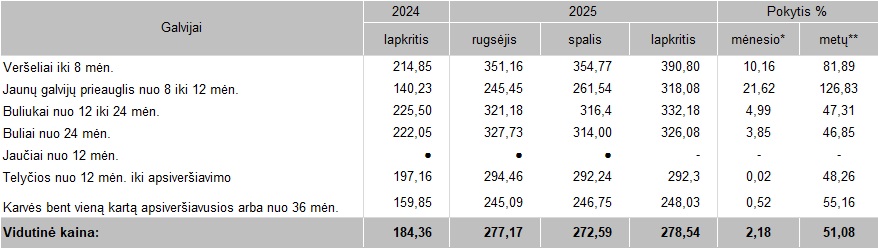 Galvijų supirkimo kainos Lietuvos įmonėse 2025 m. rugsėjo–lapkričio mėn., EUR/100 kg gyvojo svorio (be PVM)