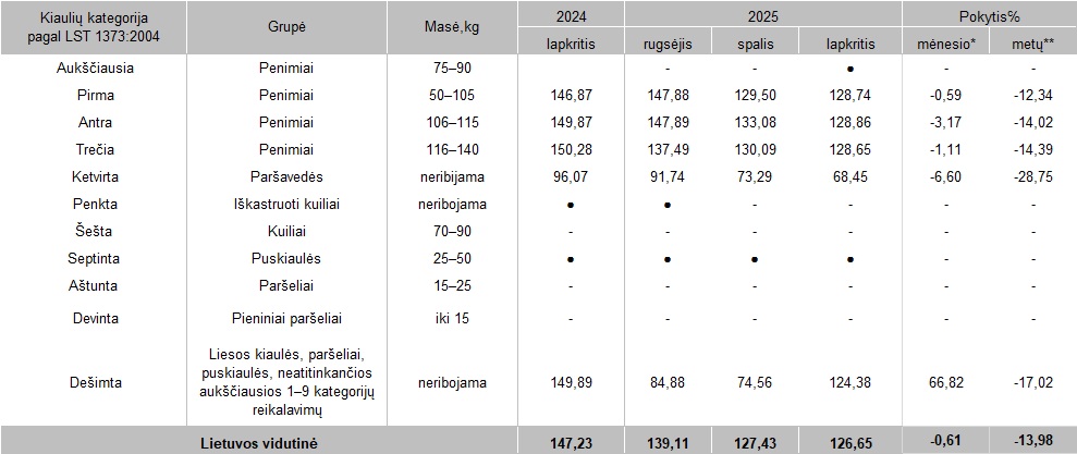 Kiaulių supirkimo kainos pagal gyvojo svorio kategorijas Lietuvos įmonėse 2025 m. rugsėjo–lapkričio mėn., EUR/100 kg gyvojo svorio (be PVM)