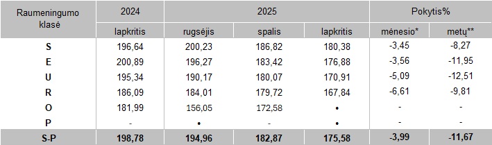 Kiaulių supirkimo kainos Lietuvos įmonėse 2025 m. rugsėjo–lapkričio mėn., EUR/100 kg skerdenų (be PVM)