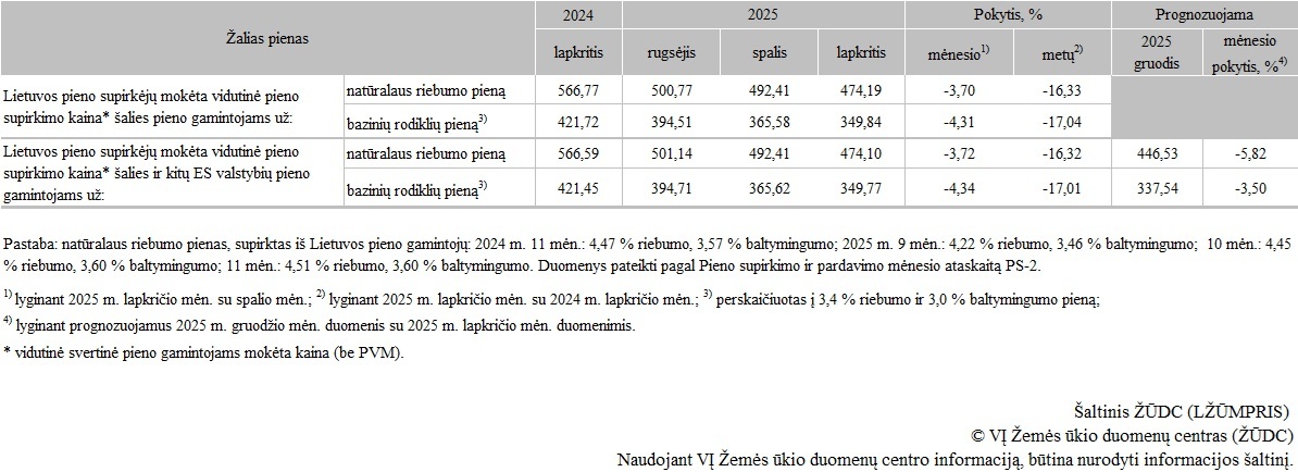 Žalio pieno, supirkto Lietuvoje iš pieno gamintojų, supirkimo kainos 2025 m. rugsėjo–lapkričio mėn., EUR/t