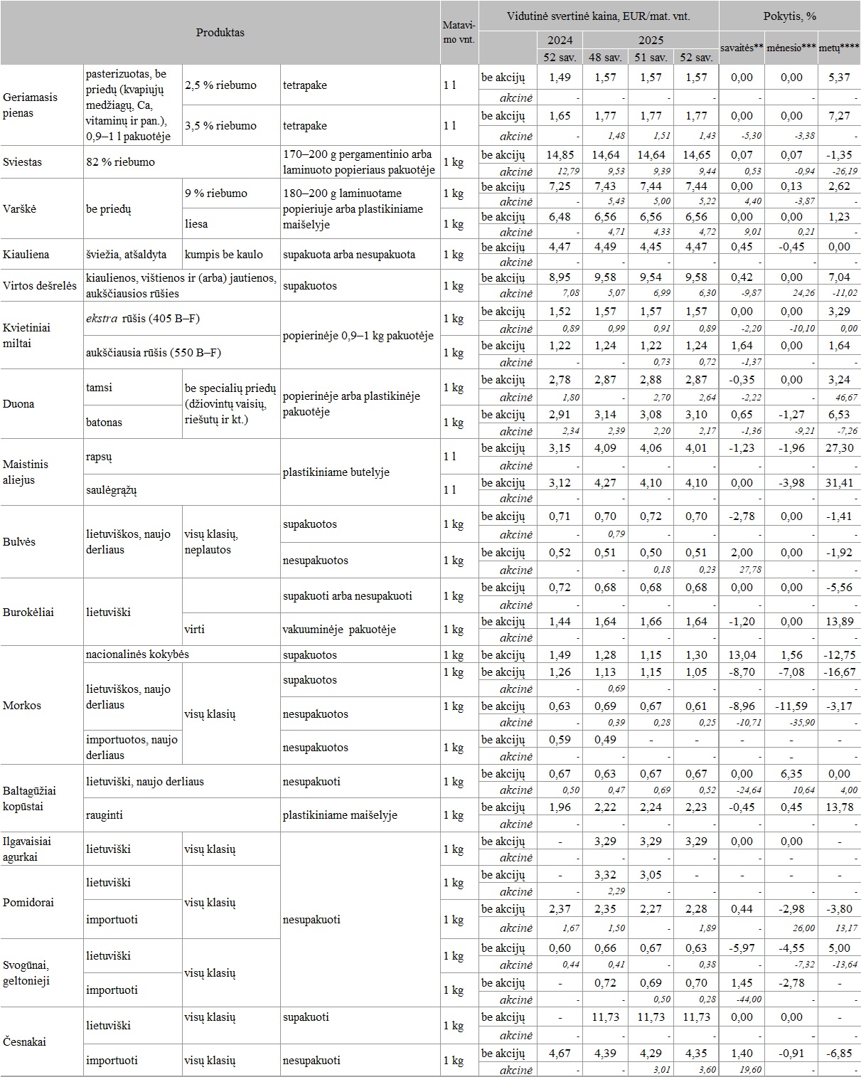 * kainos registruojamos Vilniaus, Kauno, Klaipėdos ir Panevėžio miestų UAB „Lidl Lietuva“, UAB „Maxima LT“, UAB „Norfos mažmena“, UAB „IKI Lietuva“ ir UAB „Rimi Lietuva“ prekybos tinklų parduotuvėse. Apskaičiuojant vidutines mažmenines produktų kainas, neįtraukiamos prekybos tinklų privačių prekių ženklų produktų kainos.