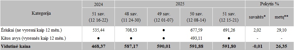 Avių kainos Lietuvos įmonėse 2025 m. 48-51 sav., EUR/100 kg skerdenų (be PVM)
