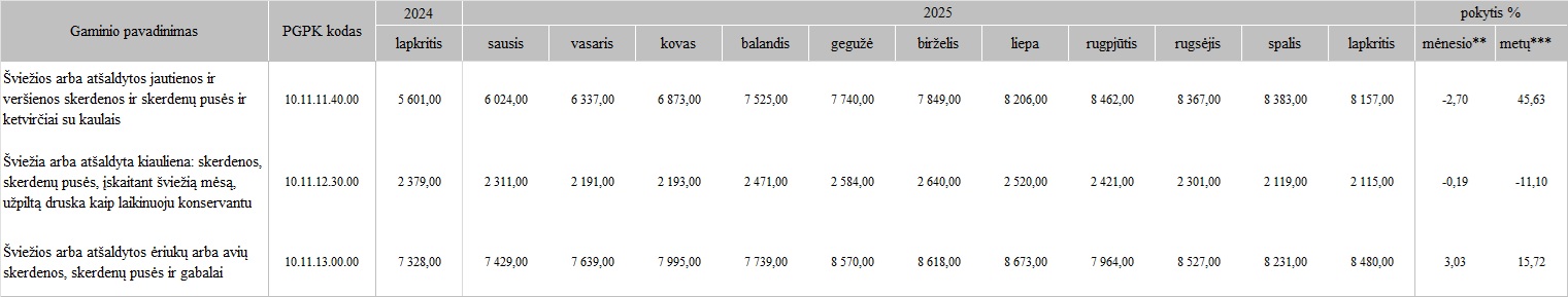 Kai kurių Lietuvos įmonėse pagamintų mėsos gaminių vidutinės pardavimo kainos* Lietuvos rinkoje 2025 m. sausio-lapkričio mėn. ir 2024 m. lapkričio mėn., EUR/t