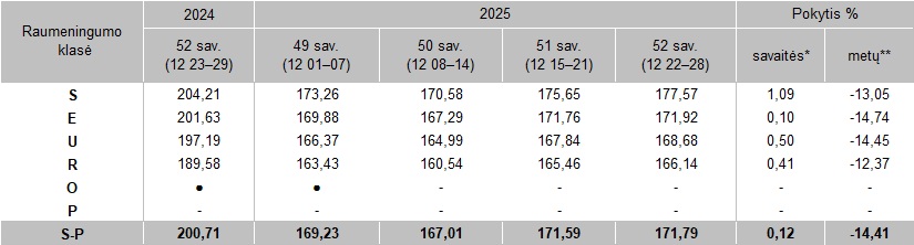 Kiaulių supirkimo kainos Lietuvos įmonėse 2025 m. 49–52 sav., EUR/100 kg skerdenų (be PVM)