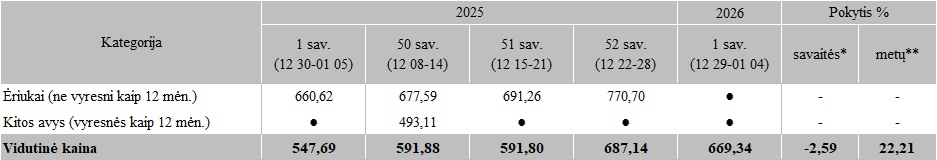 Avių kainos Lietuvos įmonėse 2025 m. 50-2026 m. 1 sav., EUR/100 kg skerdenų (be PVM)