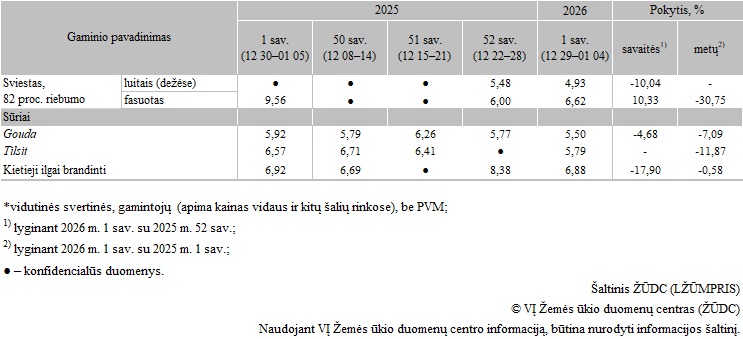 Kai kurių Lietuvos pieno perdirbimo įmonėse pagamintų pieno gaminių pardavimo kainos* 2025 m. 50 sav.–2026 m. 1 sav., EUR/kg
