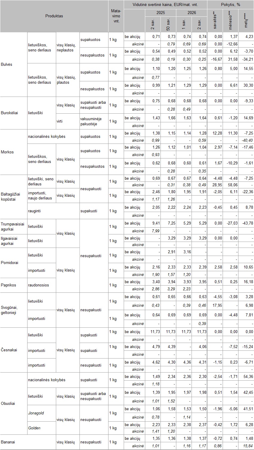 Bulvių, daržovių ir vaisių vidutinės mažmeninės kainos Lietuvos didžiųjų prekybos tinklų parduotuvėse* 2025–2026 m. 2 sav.