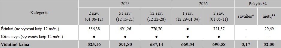 Avių kainos Lietuvos įmonėse 2025 m. 51-2026 m. 2 sav., EUR/100 kg skerdenų (be PVM)