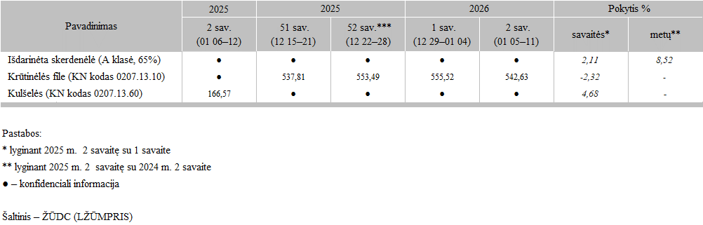Viščiukų broilerių skerdenų ir gabalų pardavimo vidutinės kainos vidaus rinkoje 2025 m. 51–2026 m. 2 sav.. EUR/100 kg (be PVM)