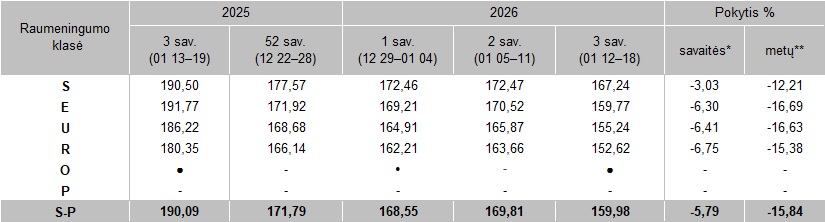 Kiaulių supirkimo kainos Lietuvos įmonėse 2025 m. 52–2026 m. 3 sav., EUR/100 kg skerdenų (be PVM)