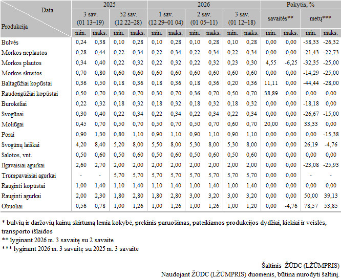 Bulvių, daržovių ir obuolių vidutinės pardavimo kainos Lietuvos prekiniuose ūkiuose ir šiltnamiuose 2025 m. (52 sav.)–2026 m. (1–3 sav.), EUR/kg (be PVM)*