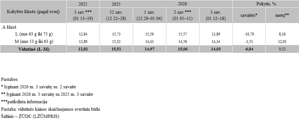 Šviežių supakuotų narvuose laikomų vištų kiaušinių pardavimo vidutinės kainos vidaus rinkoje 2025 m. 52–2026 m. 3 sav., EUR/100 vnt. (be PVM)