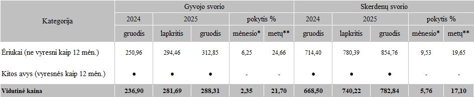 Avių supirkimo kainos Lietuvos įmonėse 2025 m. lapkričio–gruodžio mėn., EUR/100kg (be PVM)
