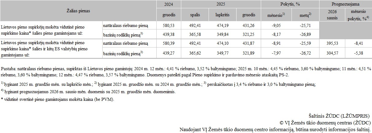 Žalio pieno, supirkto Lietuvoje iš pieno gamintojų, supirkimo kainos 2025 m. spalio–gruodžio mėn., EUR/t