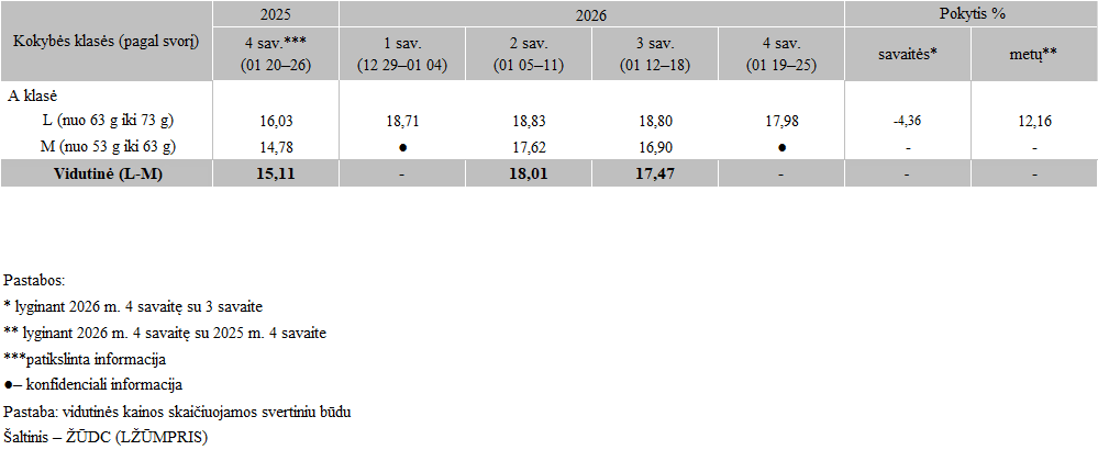 Šviežių supakuotų ant kraiko laikomų vištų kiaušinių pardavimo vidutinės kainos vidaus rinkoje 2026 m. 1–4 sav. EUR/100 vnt. (be PVM)