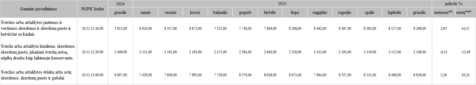 Kai kurių Lietuvos įmonėse pagamintų mėsos gaminių vidutinės pardavimo kainos* Lietuvos rinkoje 2025 m. sausio-gruodžio mėn. ir 2024 m. gruodžio mėn., EUR/t