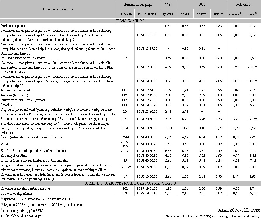 Kai kurių Lietuvos įmonėse pagamintų pieno gaminių vidutinės pardavimo kainos* vidaus rinkoje 2025 m. spalio–gruodžio mėn., EUR/kg